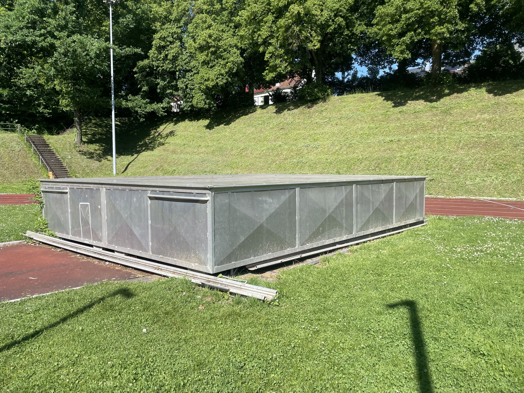 Die Abdeckhaube hat die Maße L= 7,30 m und B= 5,80 m. Sie befindet sich aktuell im Stadion der Turnerschaft Göppingen e.V. und müsste von dort abgeholt werden (Nördliche Ringstr. 125, 73033 Göppingen).