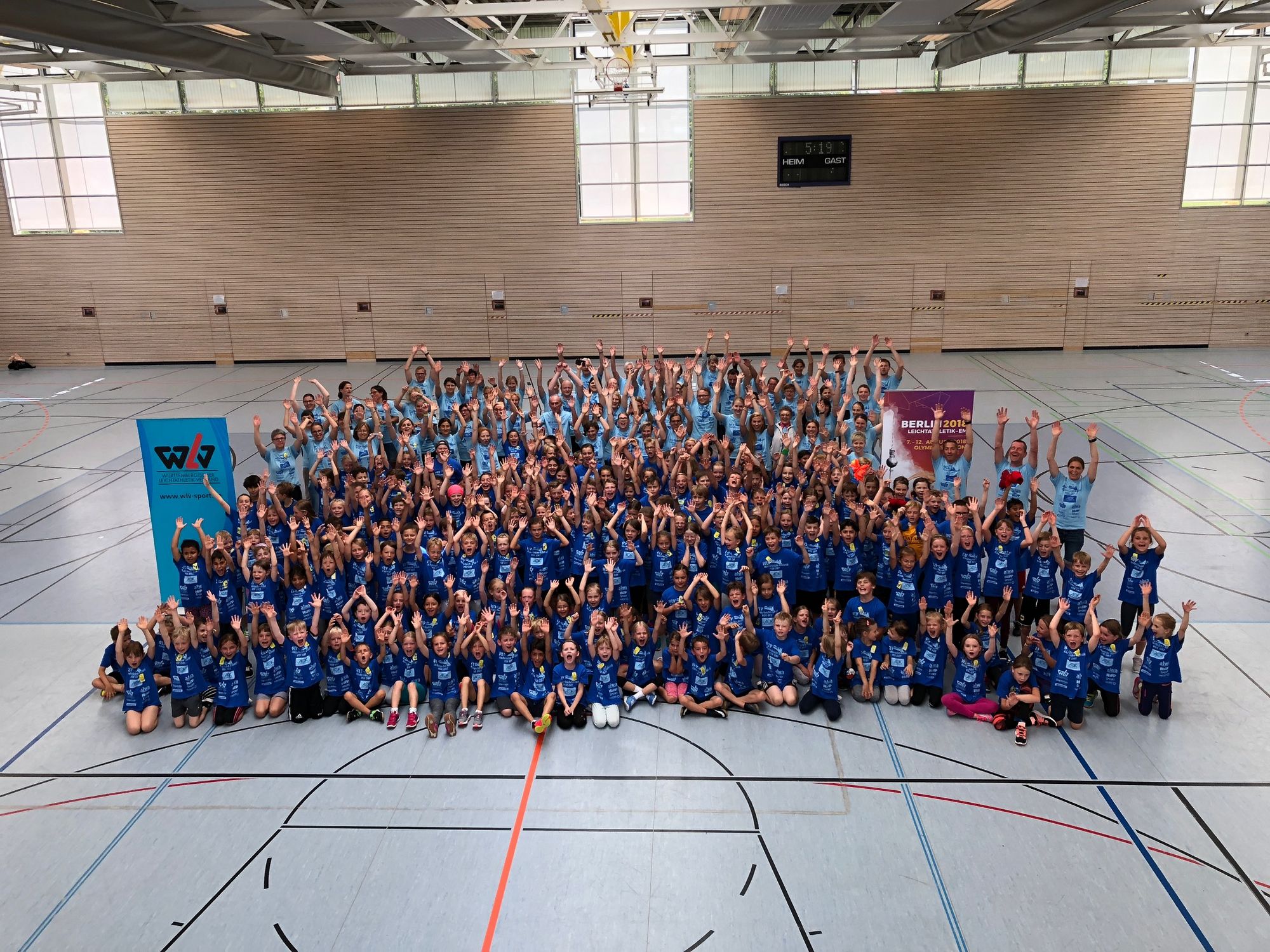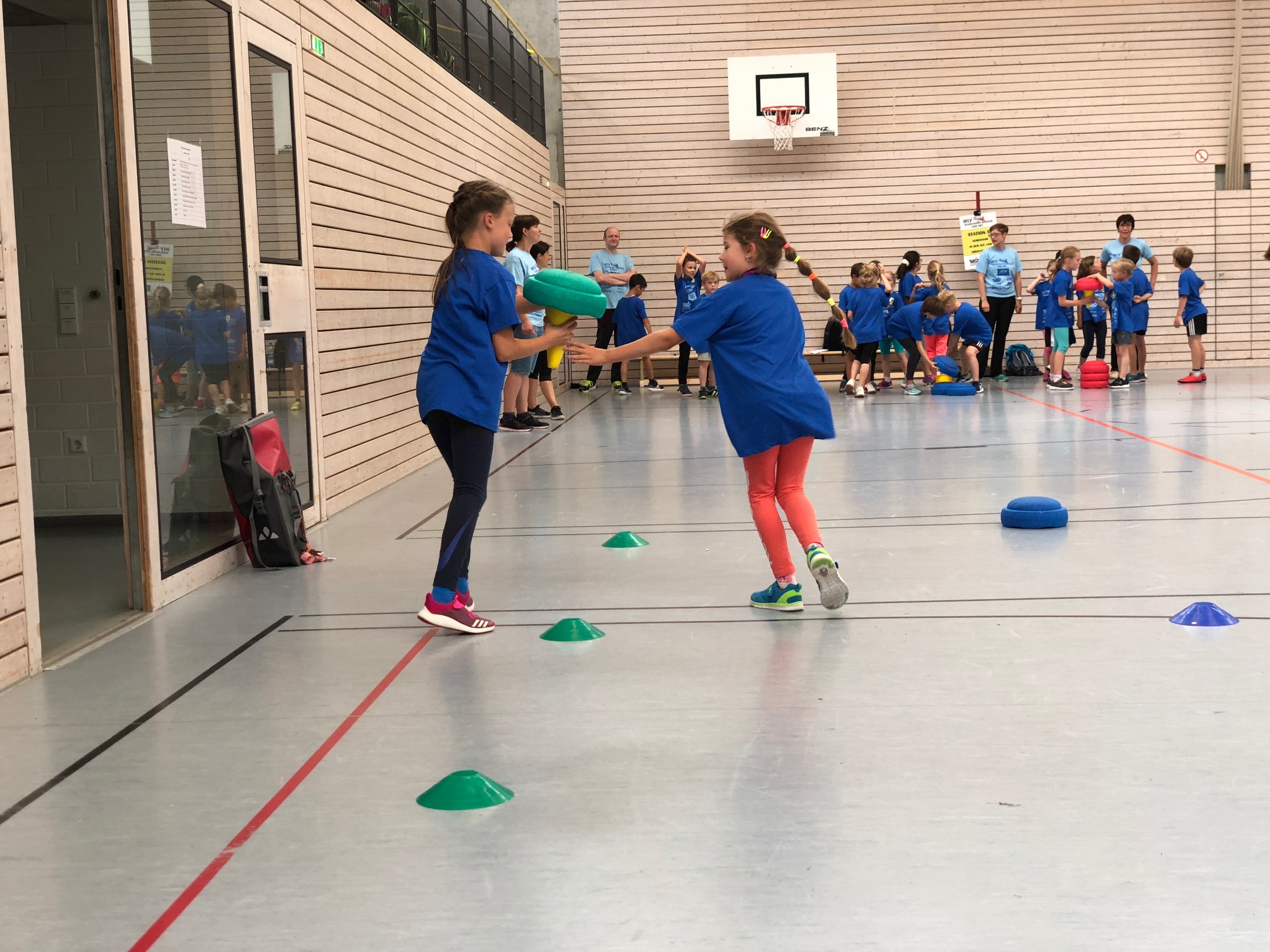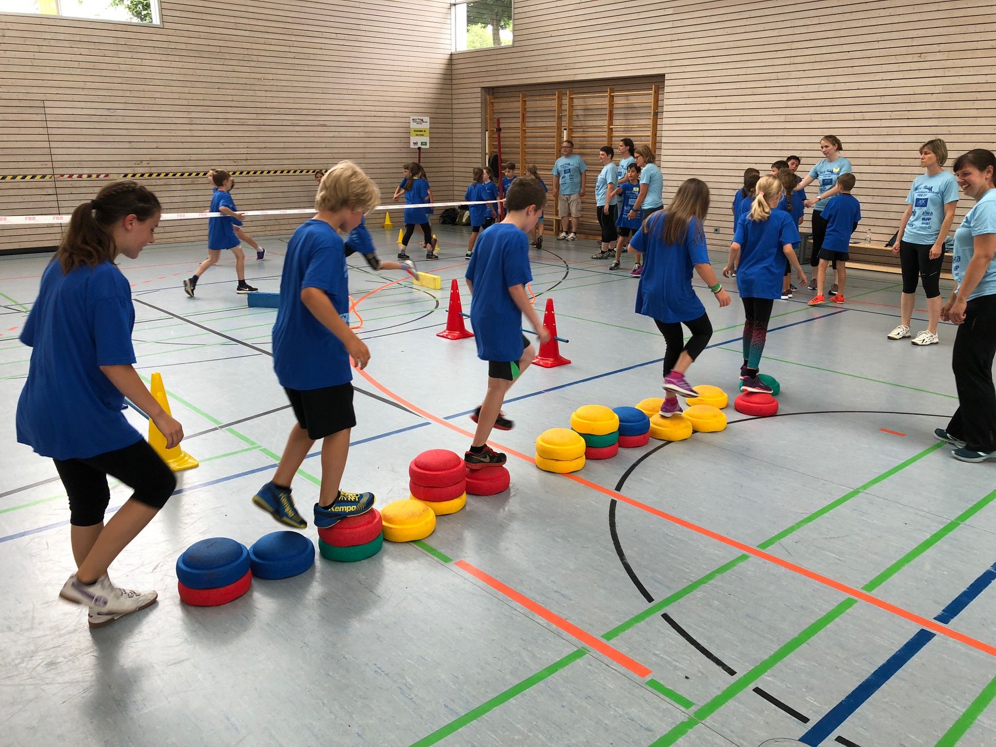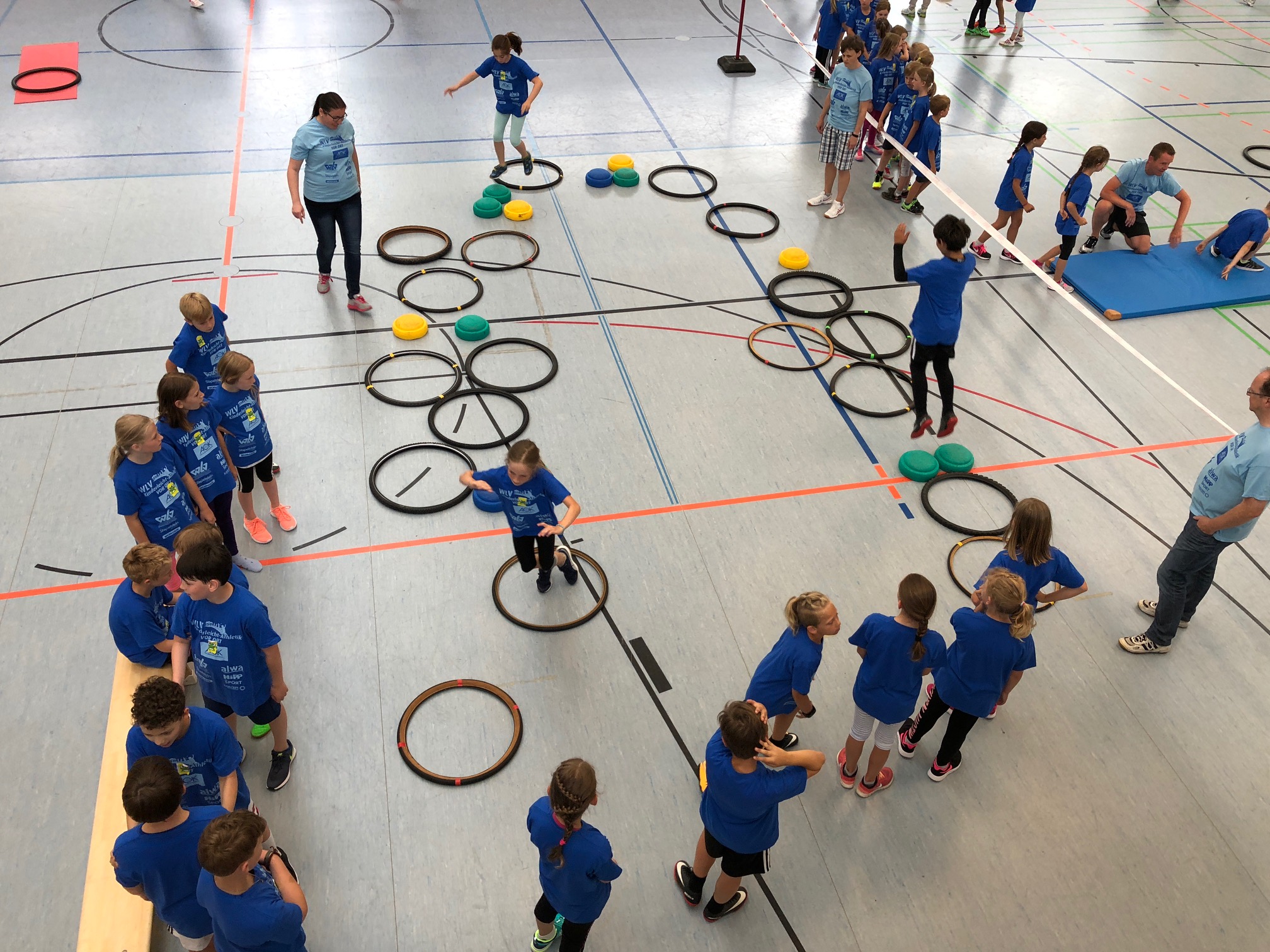 Nach dem optimistischen Aufbau draußen entschied sich das WLV-Team aufgrund von stärker werdendem Regen doch dazu, alle acht Stationen in die Drei-Felder-Halle der Grundschule zu verlegen. Mithilfe der vielen Helfer war der Umzug schnell geschafft, sodass alles bereitstand, als die 200 Kinder der Adolf-Rehn-Schule ankamen.