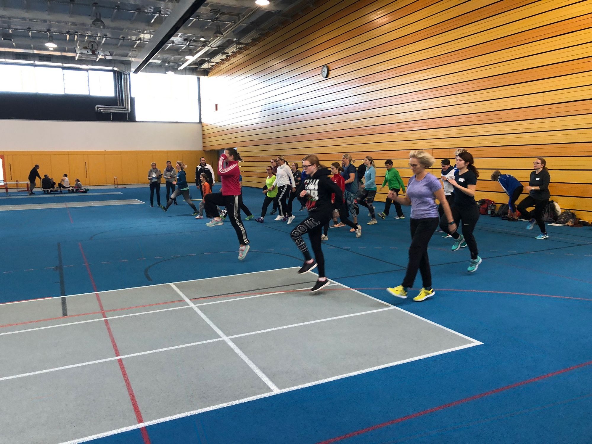 Nach einem ausgiebigen Mittagessen im Sportrestaurant Neckarpark mit einer Vielzahl an interessanten Gesprächen und mit regem Austausch zwischen den Teilnehmerinnen ging es im Seminarraum weiter. Florian Bauder als Landestrainer Mehrkampf stellte zunächst in einer kurzweiligen Präsentation die Möglichkeiten und Varianten im Training mit größeren Gruppen vor,bevor es dann in der Halle an das praktische Üben und Ausprobieren ging.